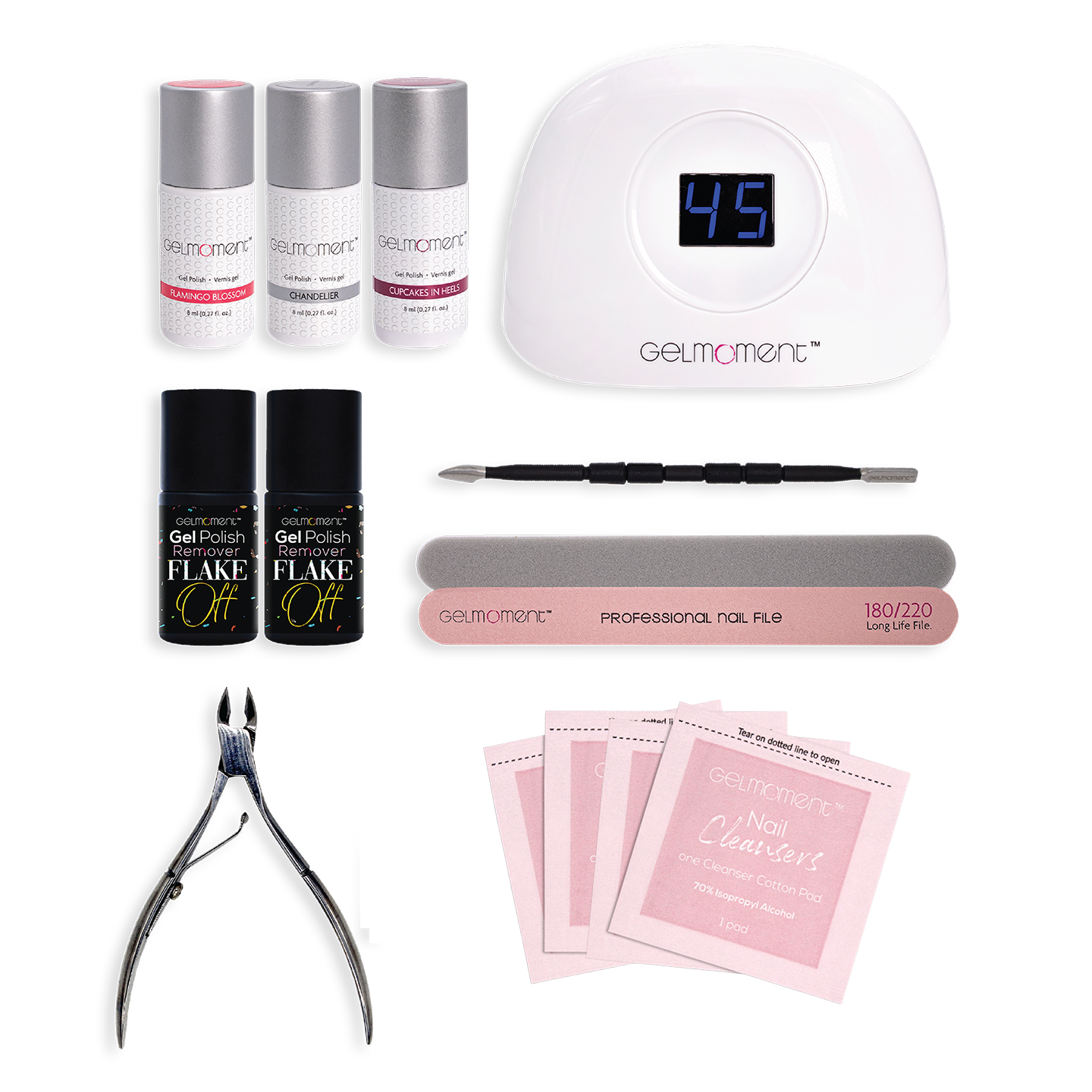 The Deluxe Customer Kit is designed for those who are comfortable in applying GelMoment Gel Nail Polish and are ready to use our Deluxe Four Finger Lamp, which works by automatic sensor!